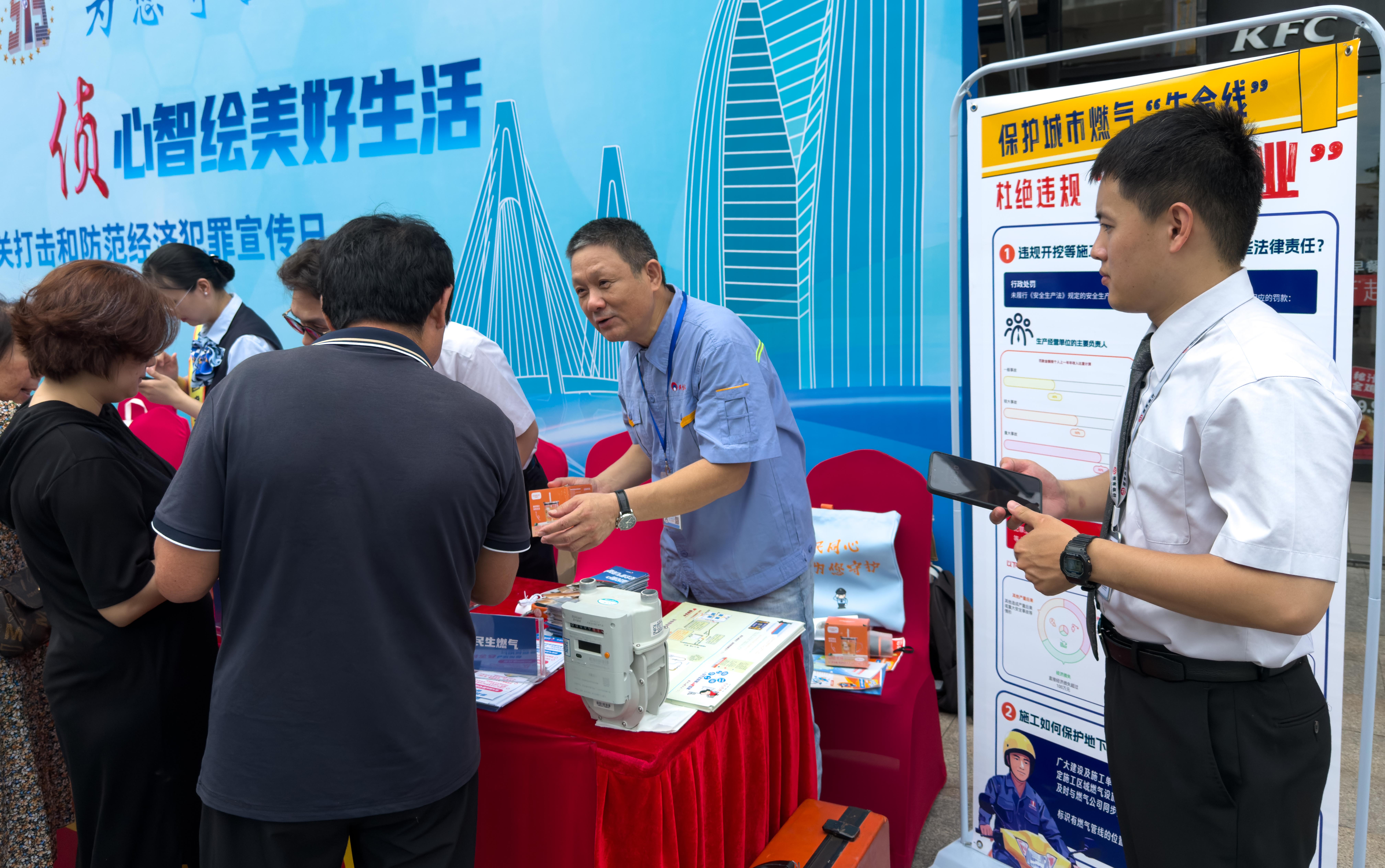 2024年5月15日,海南民生燃?xì)夥e極響應(yīng)第十六個全國公安機(jī)關(guān)打擊和防范經(jīng)濟(jì)犯罪宣傳日號召,在海口市國貿(mào)商圈友誼國貿(mào)城開展第三方施工保護(hù)燃?xì)庠O(shè)施相關(guān)法規(guī)普及與用氣安全宣傳活動。公司管網(wǎng)中心技術(shù)員余孝東,營業(yè)中心技術(shù)員黃斌及巡檢人員參加本次活動。
